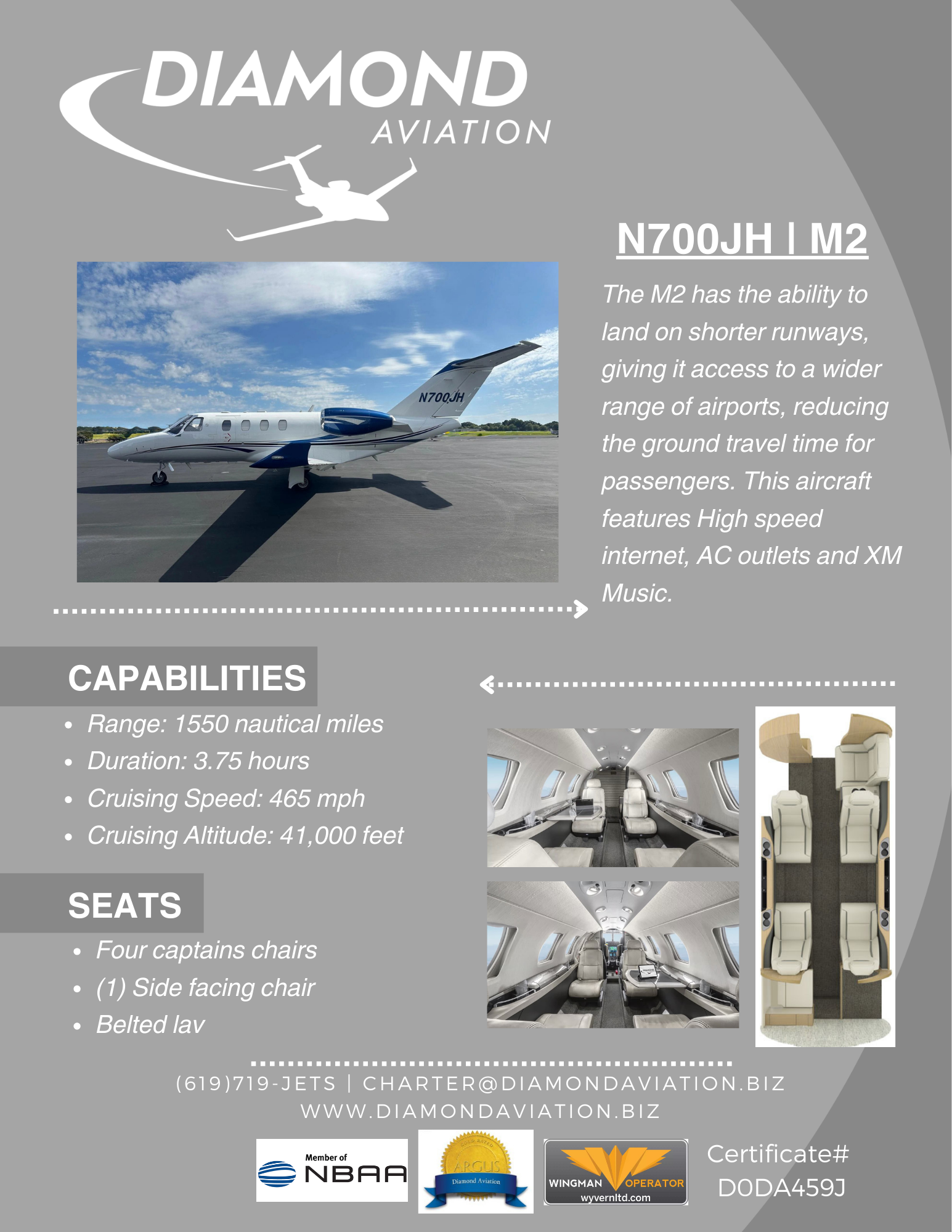 The N700JH | M2 is renowned for its combination of speed, range, and flexibility. Perfect for corporate or private use, this aircraft features high speed internet, XM Music, and is equipped with AC outlets.